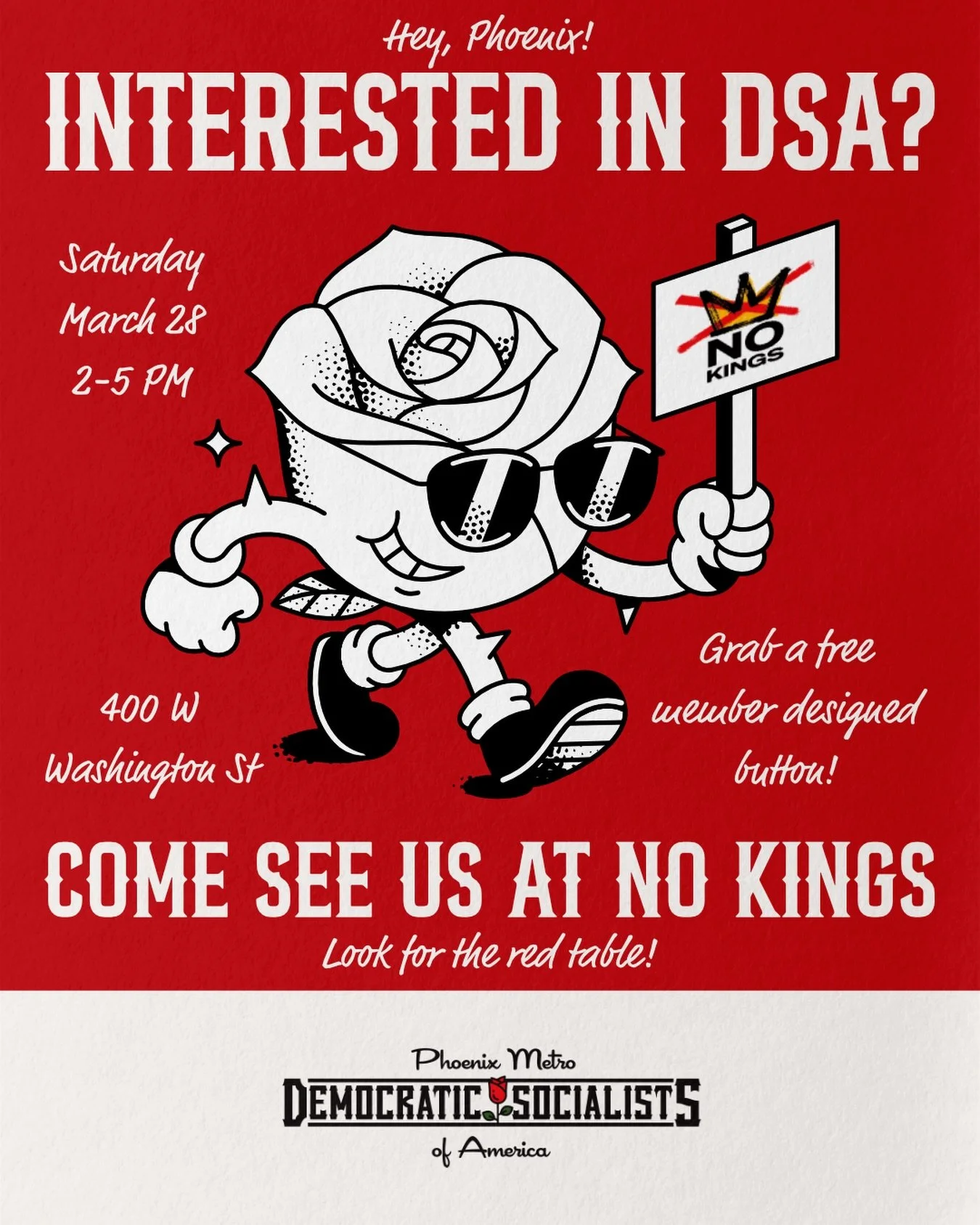 Phoenix DSA welcomes you no matter your availability or level of commitment. DSA is a broad, diverse coalition of workers, activists, parents, and students. We welcome your support and camaraderie in any form or capacity.